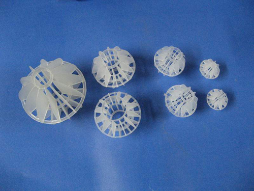 采用聚丙烯塑料制成球狀,在球中部沿整個(gè)周長有一道加固環(huán),環(huán)的上下各有十二片球瓣,沿中心軸呈放射形布置,適用于二氯化碳脫氣塔,接觸反應(yīng)塔等裝置。